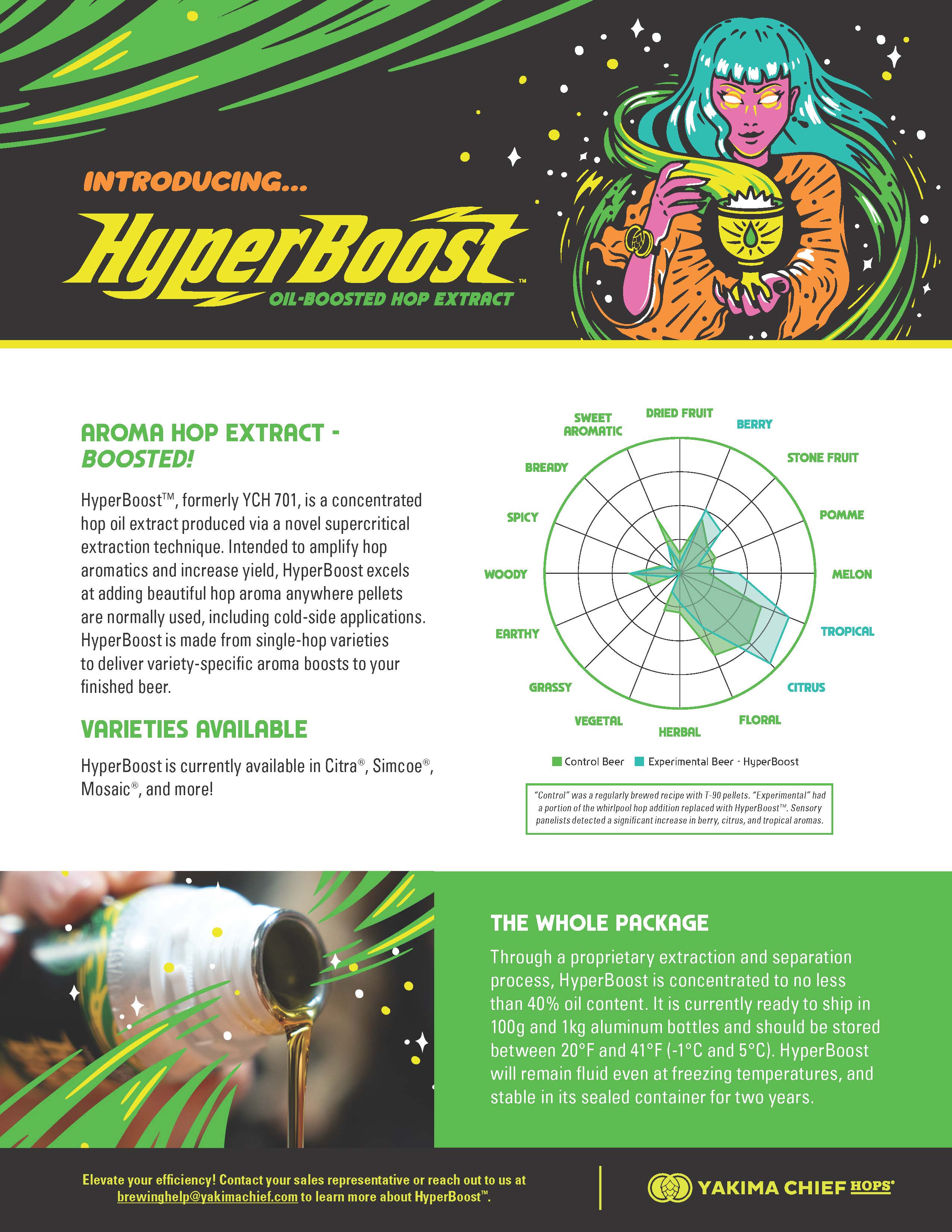 Use HyperBoost for 25-50% of your total dry hop charge.
